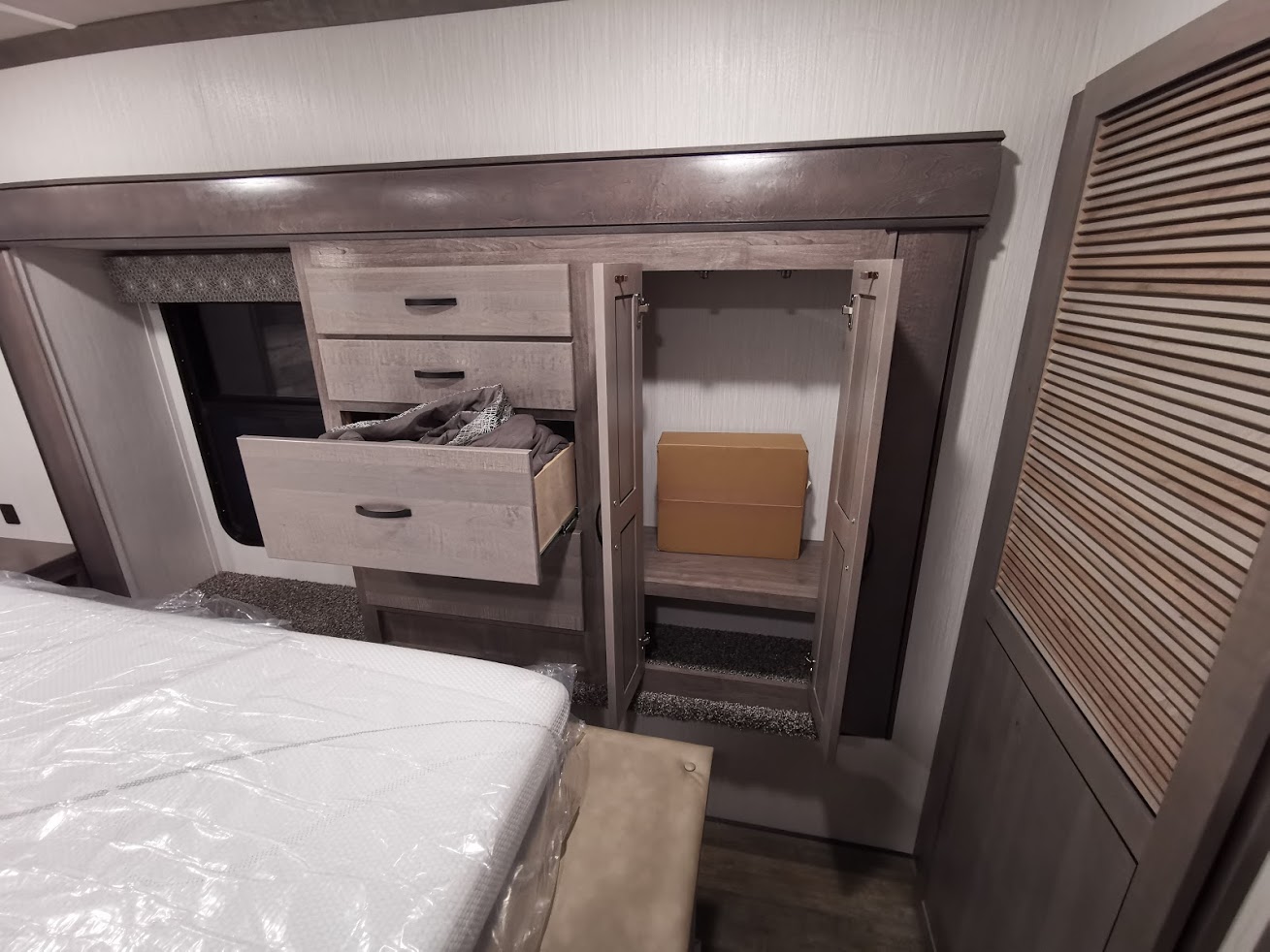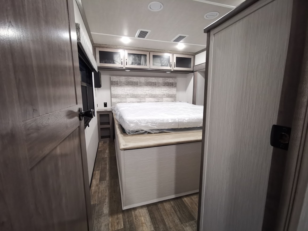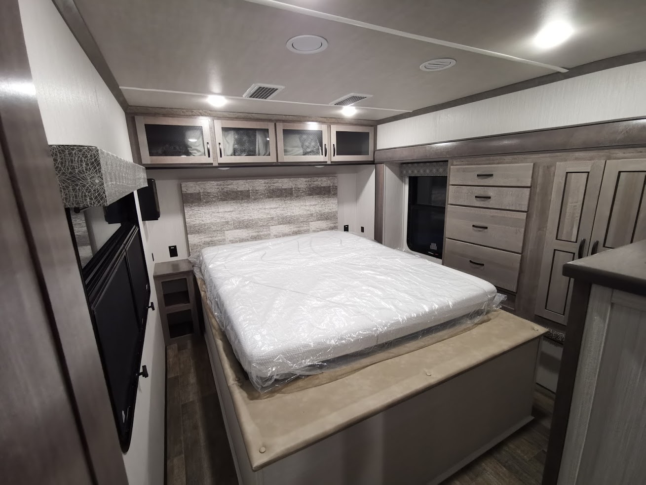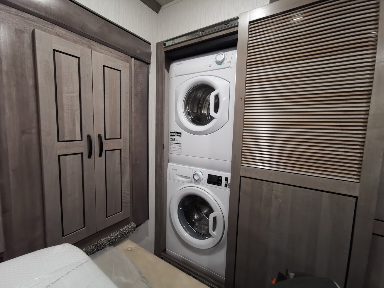 Im Schlafzimmer wartet das King Bed sowie ein riesen Kleiderschrank . Zusätzlich hat dieser Trailer eine Wasch/trocknerkombination integriert.
