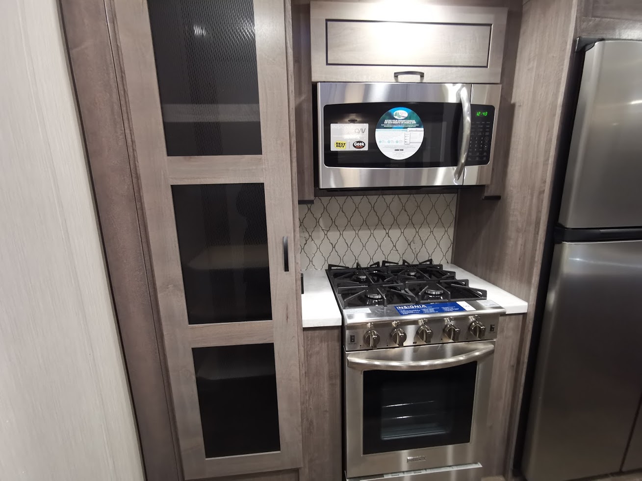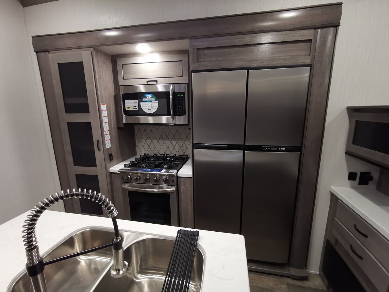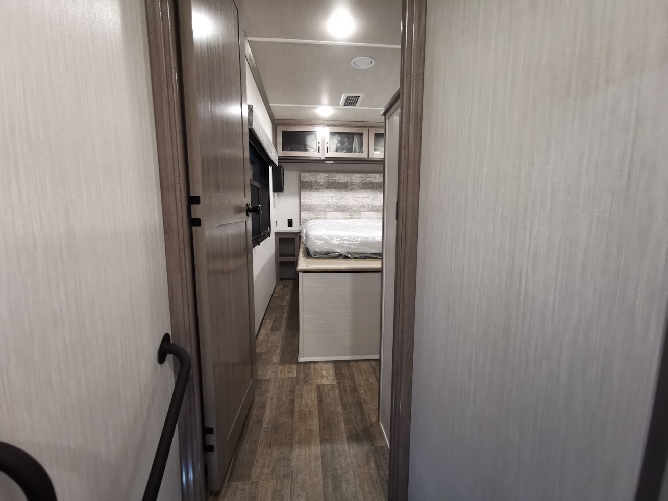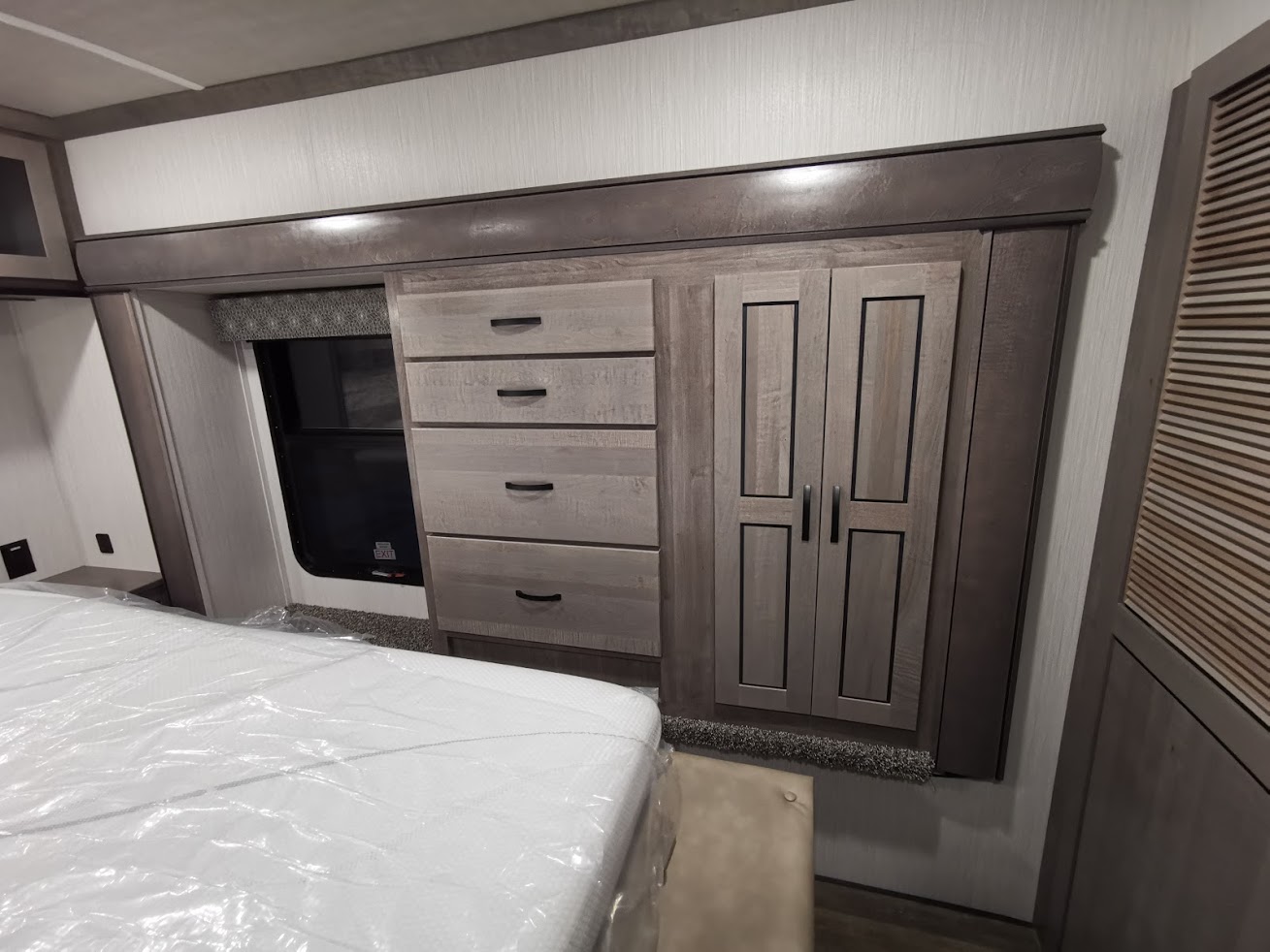 Im Schlafzimmer wartet das King Bed sowie ein riesen Kleiderschrank . Zusätzlich hat dieser Trailer eine Wasch/trocknerkombination integriert.