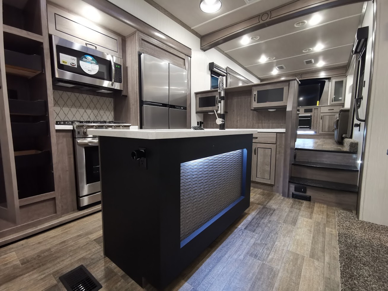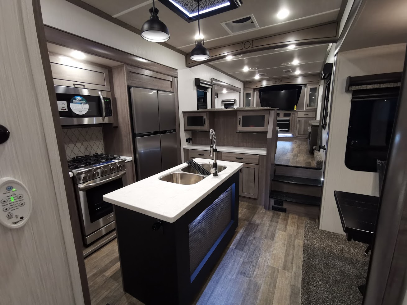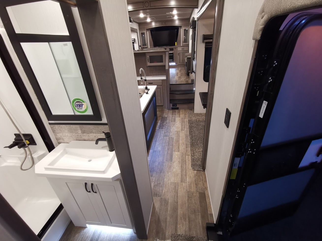 - Full Docking Station with Multi-Function Tank Levers, Outside Shower, Black Tank Flush, 12V Battery Disconnect