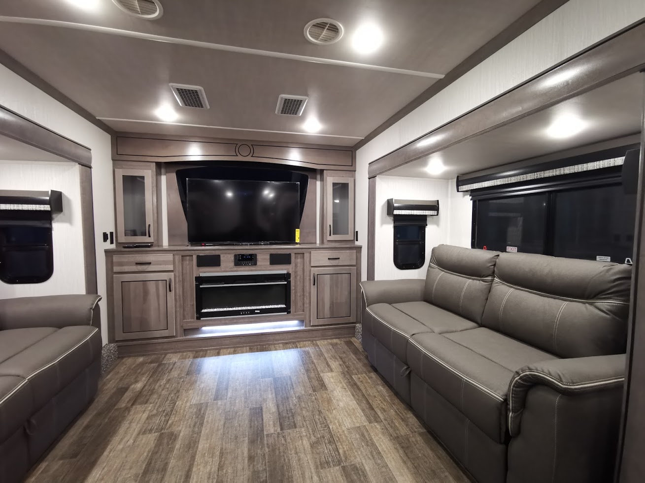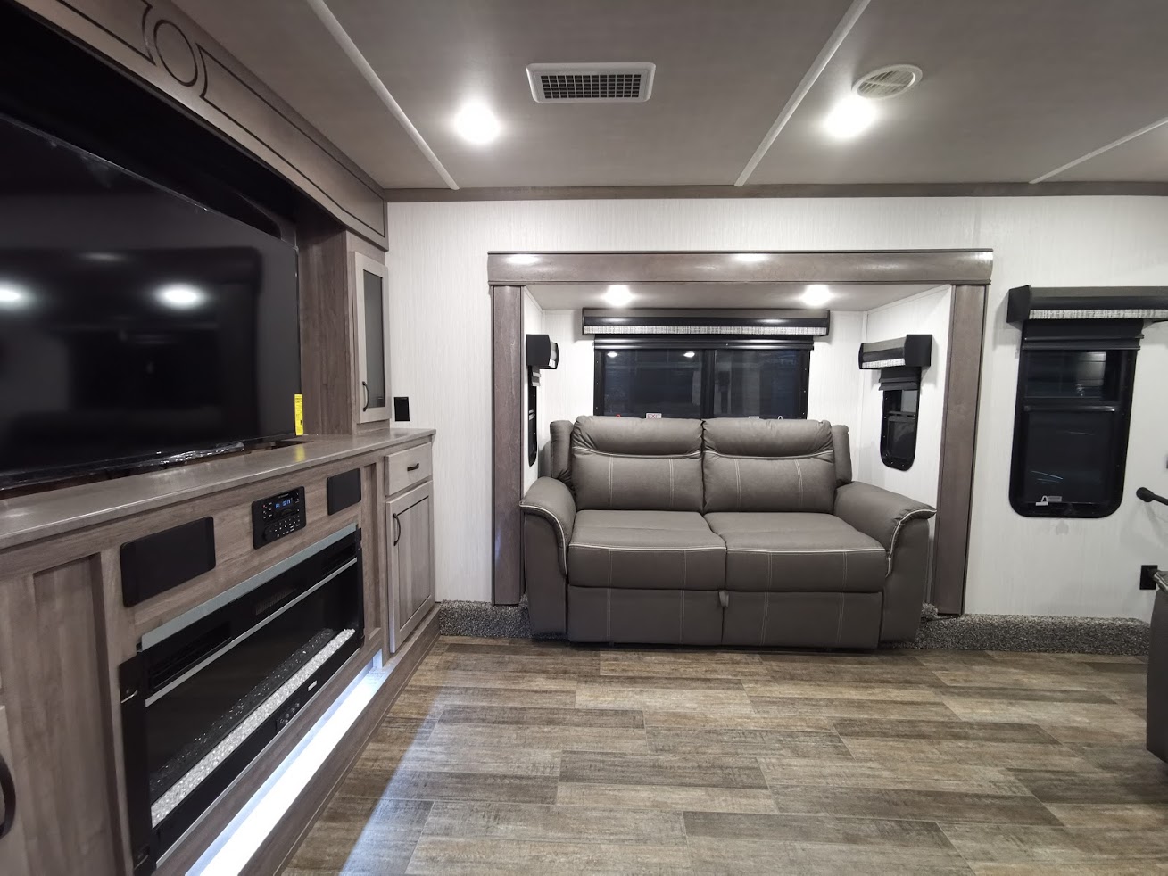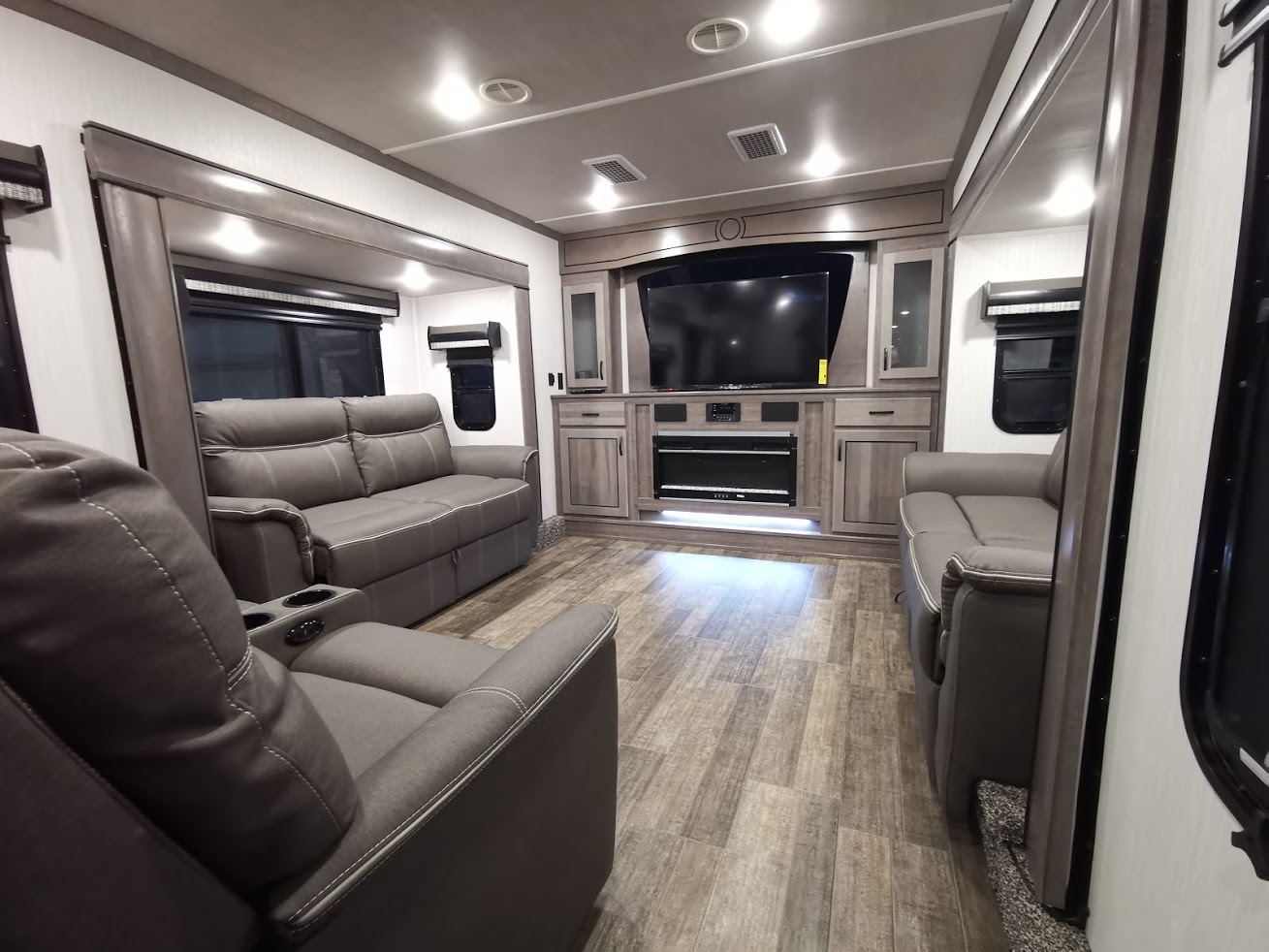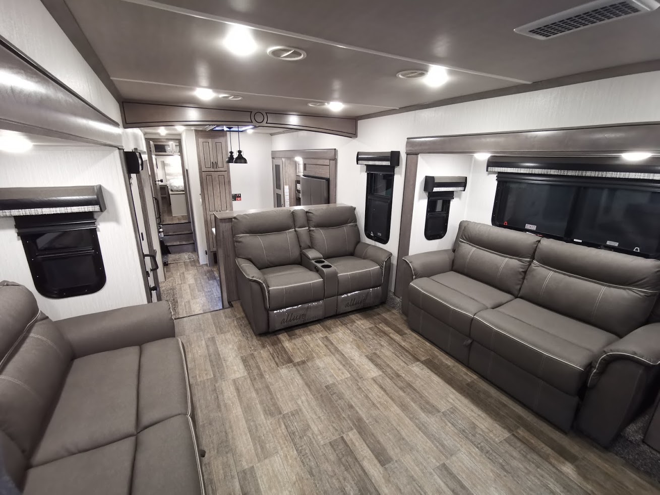 Der 385 TH hat sein Wohnzimmer mit drei extrem gemütlichen Sofas im vorderen Bereich des Trailers und Sie genießen den Ausblick nach vorne durch ein riesiges Panoramafenster.