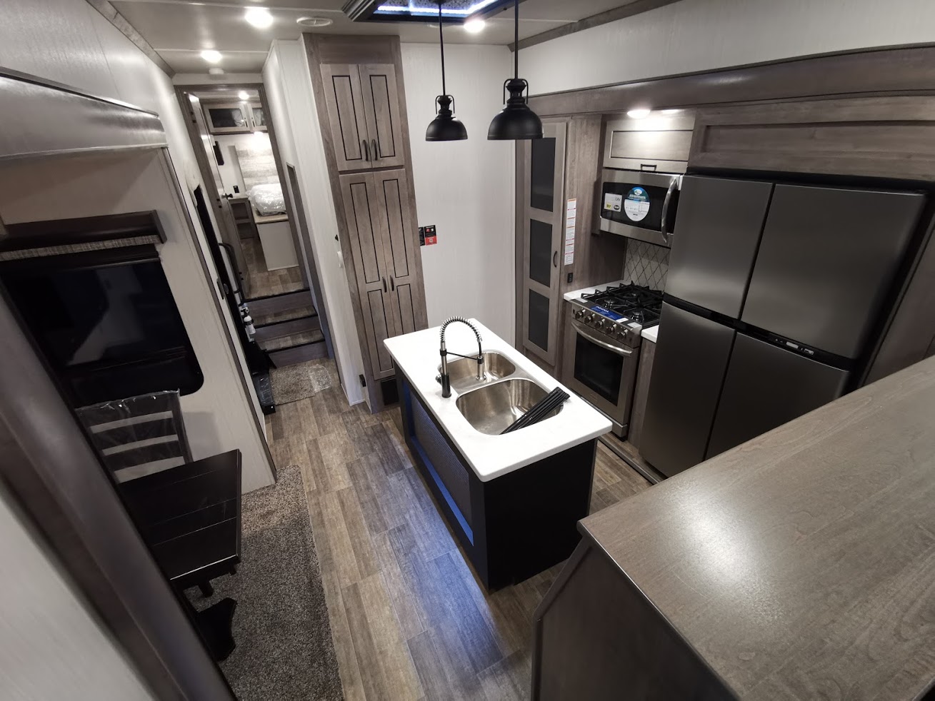 Der Mittelbereich des Trailer wird durch den Küchen/Essbereich bestimmt und hat neben