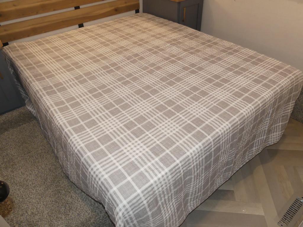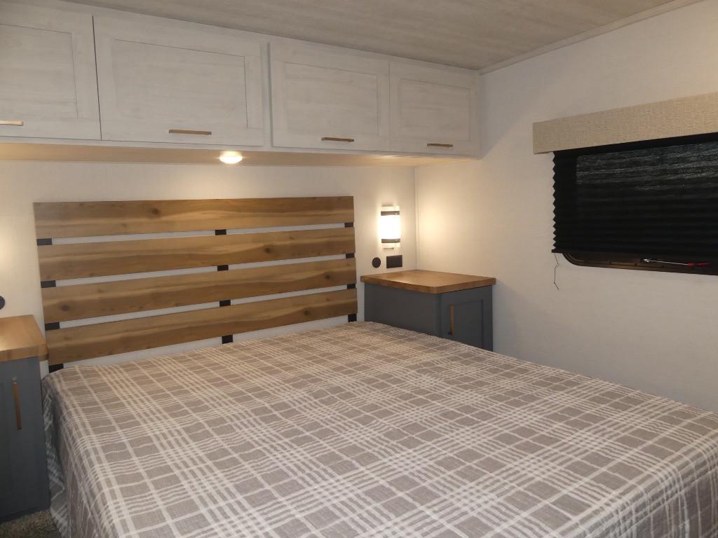 Schlafbereich mit Queensbett und vielen Stauschränken sowie großen Hängeschrank und Bettkasten mit Stauraum.