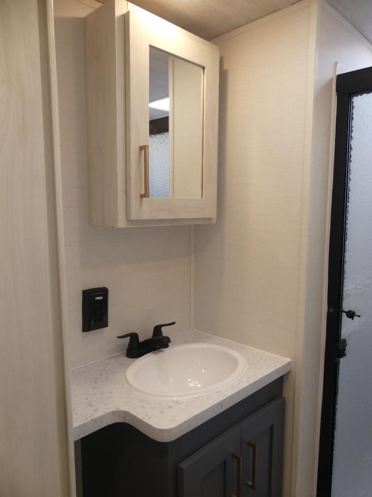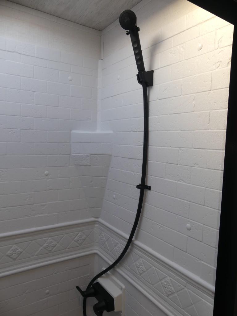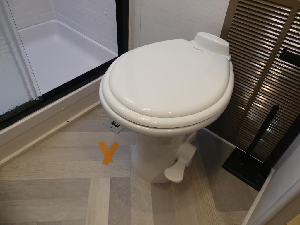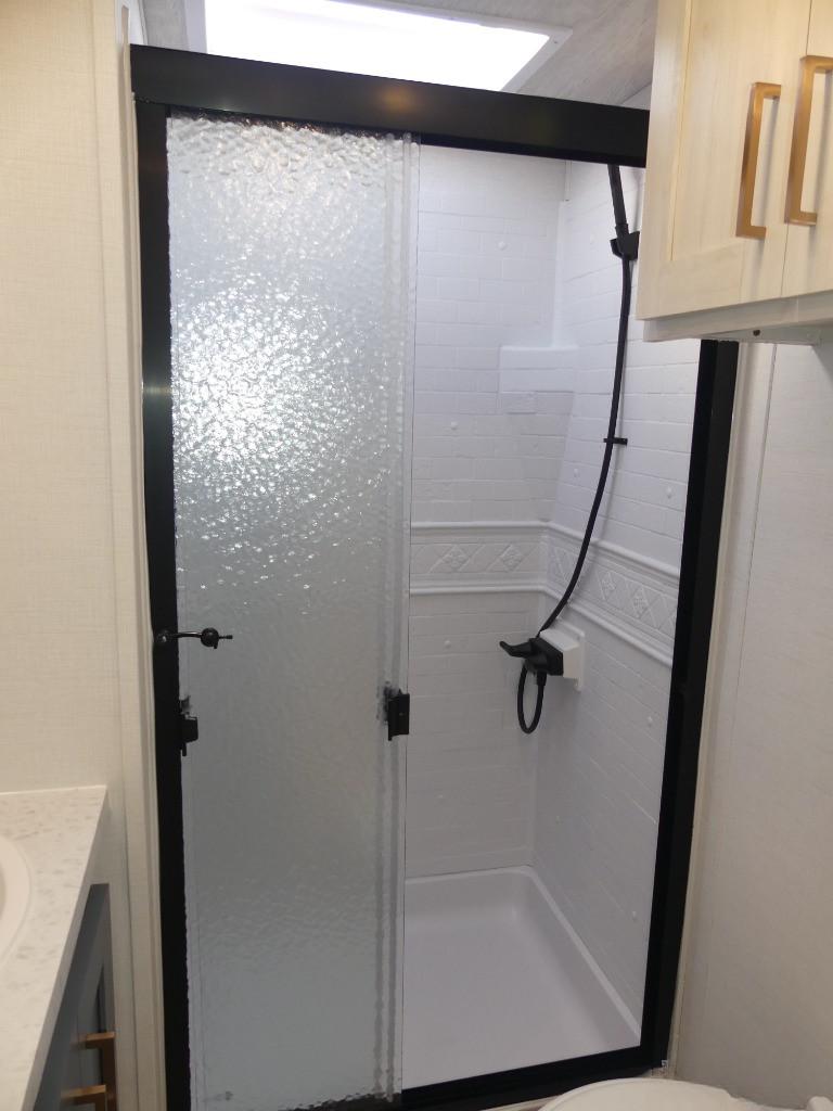 Badezimmer mit XL Dusche sowie fester Trennwand. Festtoilette mit grossen 280 Liter Tank.