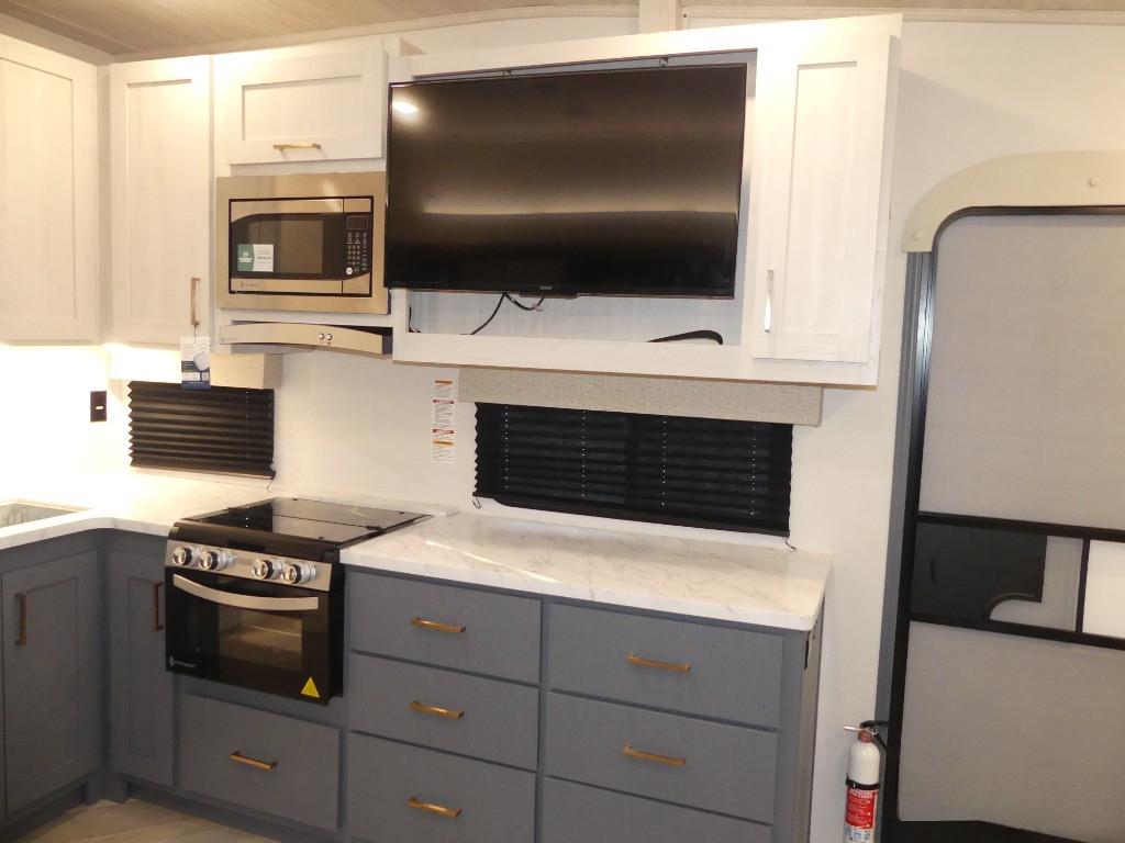 Moderner Küchenbereich mit French Style Kühlschrank, Mikrowelle, Gasbackofen.