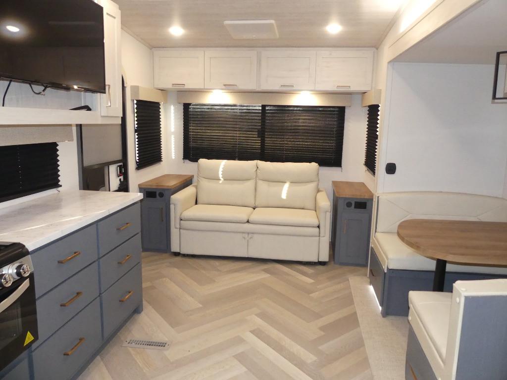 Wohnbereich mit Schlafsofa und gemütlicher Dinette sowie TV Gerät.