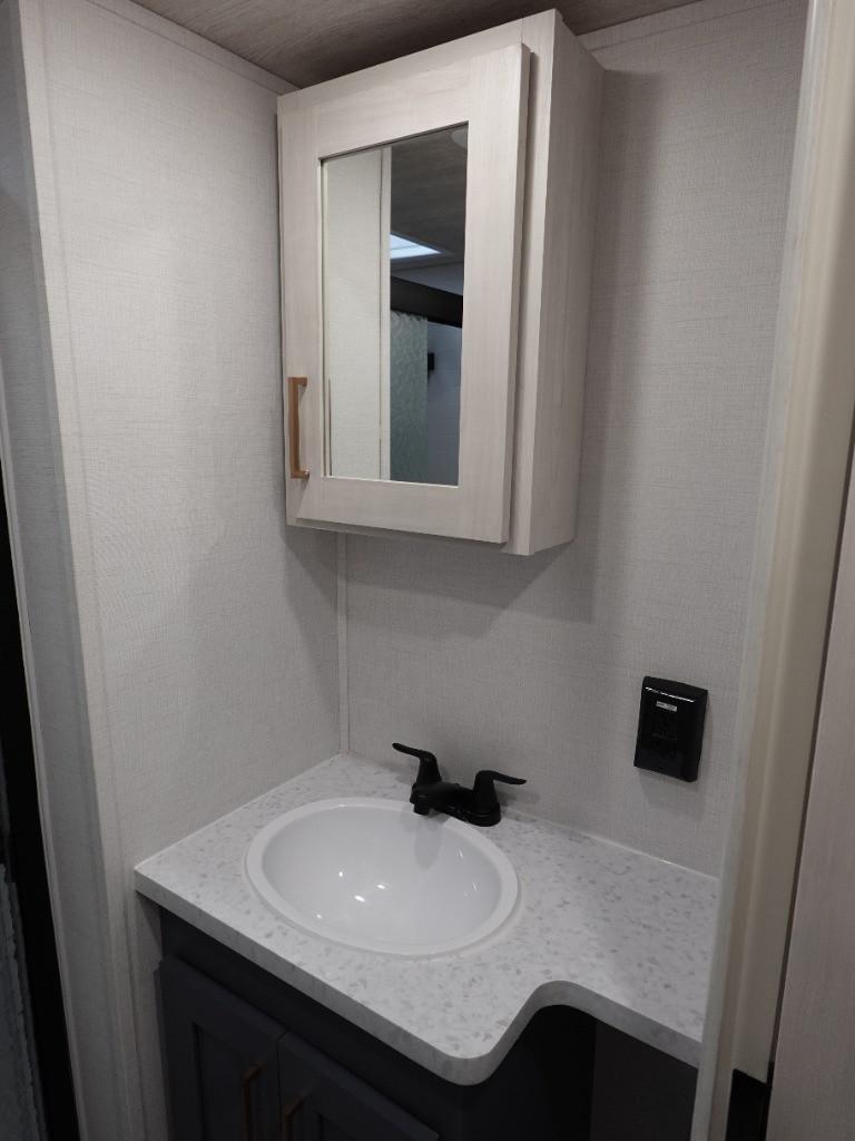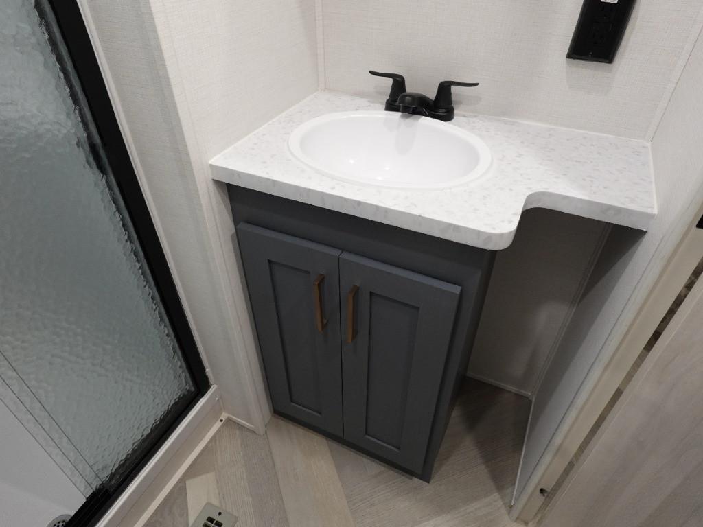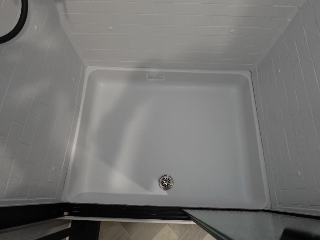 Badezimmer mit XL Dusche sowie fester Trennwand. Festtoilette mit grossen 129 Liter Tank.
