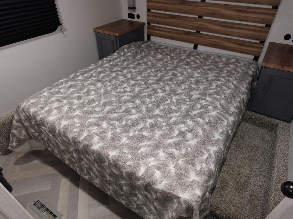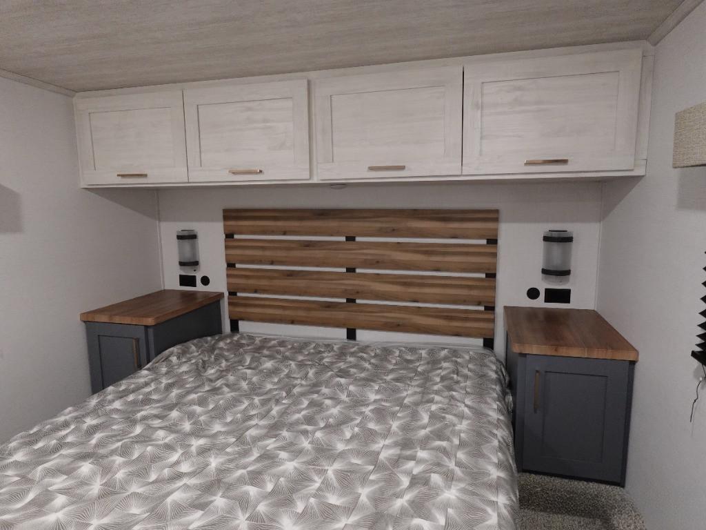 Schlafbereich mit Queensbett und vielen Stauschränken sowie großen Hängeschrank und Bettkasten mit Stauraum.