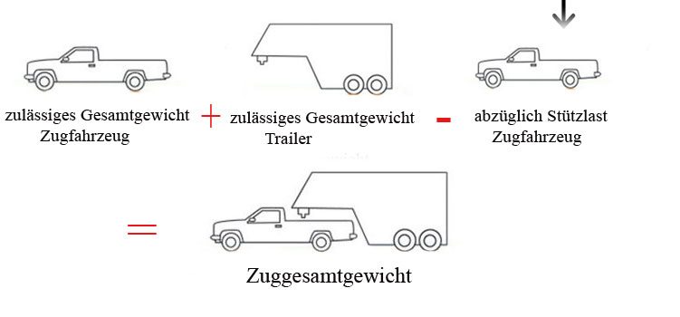 Das Zuggesamtgewicht wird jeweils von dem Hersteller des Zugfahrzeuges vorgegeben bzw in DE mit folgenden Daten berechnet.